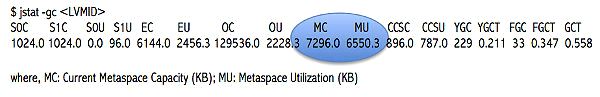 - jstat –gc <LVMID>: now prints Metaspace information as shown in the following example: