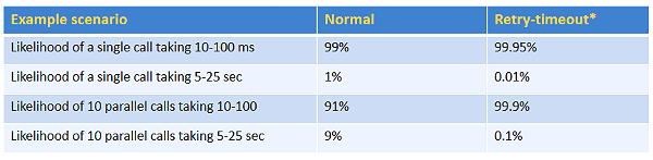 So let us see how this could improve our performance compared to the performance we had above. As we calculated, with no timeout/retry the likelihood of the call taking 5-25 seconds was 9%. Let us use 2 retries (total 3 calls), and use an initial timeout of 100ms coupled with a final timeout of 30 seconds. Using this approach, the chance of getting a timeout drops to 0.1% [1 - (0.99 * 0.99) ^ 10] so we have reduced the likelihood by 900 times! Similar to parallelisation, the retry-timeout code needs to be streamlined into a coding pattern so the callers do not have to implement it everywhere.