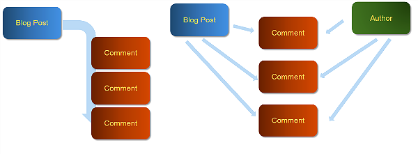 What if we need a signed-in user to be able to see all the comments he has left? One option is to have an embedded comment entity as above in the Blog Post domain and to have another embedded comment entity with the user and store the first few characters and its link inside the User domain.