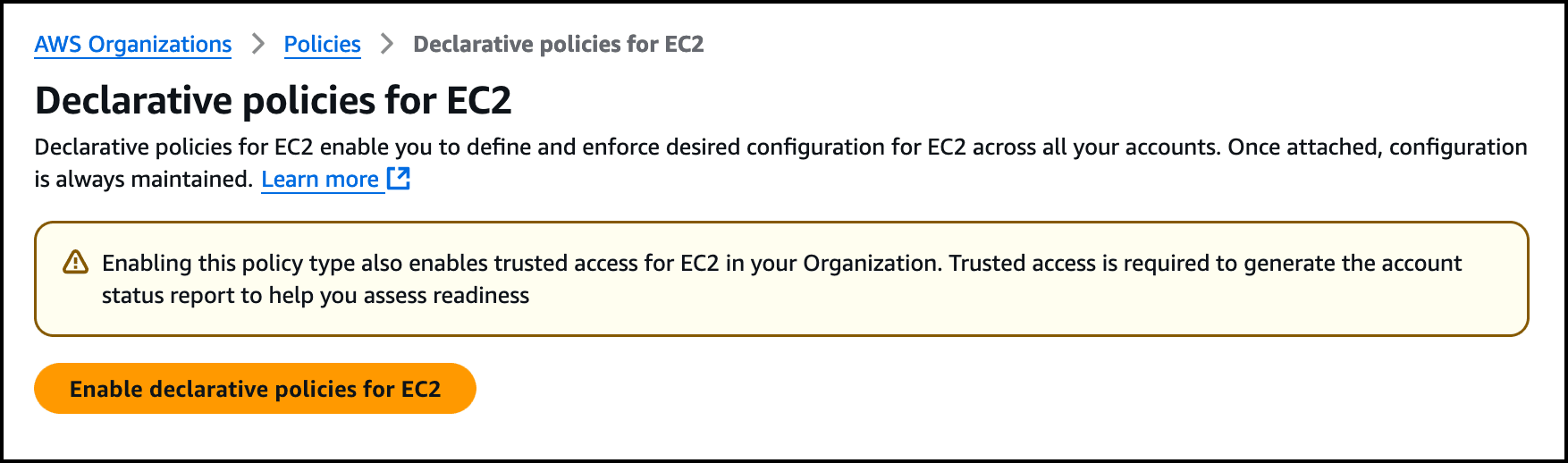 開始するにはAWS Organizationsコンソールに移動し、ナビゲーションペインからポリシーを選択する。そこから、サポートされているポリシータイプのリストの下にあるEC2の宣言型ポリシーを選択する。有効にするとユーザーはAWS Organizations内のすべてのアカウントにわたってEC2の望ましい構成を定義し、適用する能力を持つことになる。