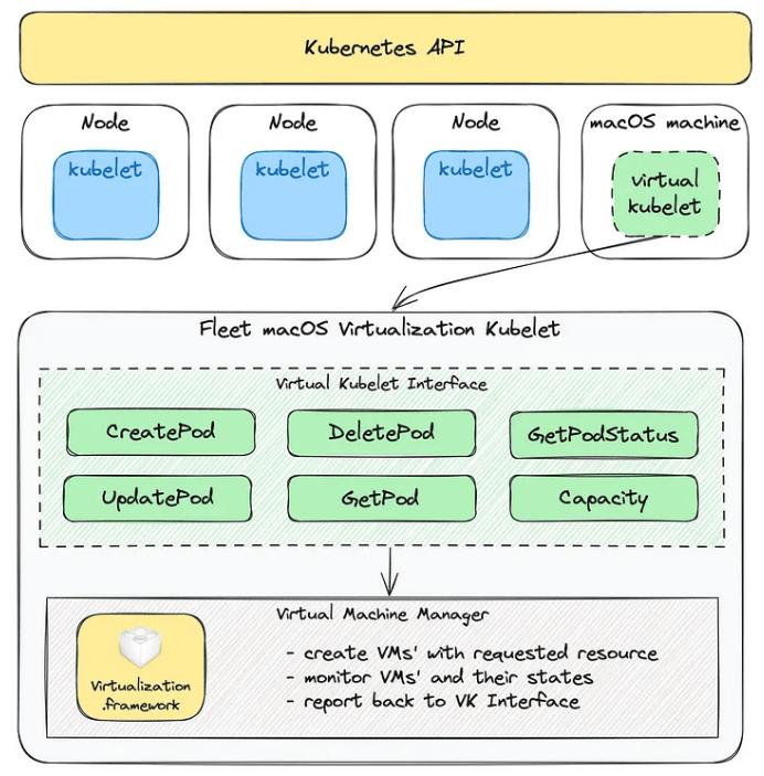 これらの課題を克服するため、KubernetesがネイティブのmacOSワークロードを直接管理できるよう、AgodaはmacOS-vz-Kubeletを開発した。このプロジェクトはGoを用いて構築され、AppleのVirtualization Frameworkを活用して、Apple Siliconハードウェアの性能を完全に継承したmacOS仮想マシン(VM)を実行する。このソリューションは旧来の方法を置き換えるだけでなく、macOSワークロードを持つPodのシームレスなデプロイを可能にしている。